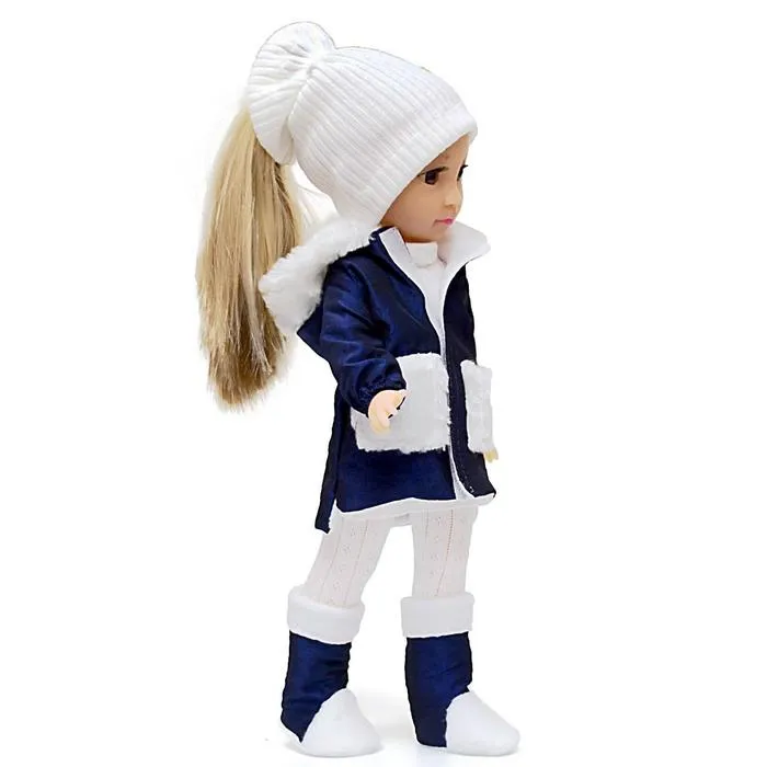- В комплект одежды входит: тёплая курточка с меховыми элементами, белые штанишки и водолазка, шапочка, ботиночки.