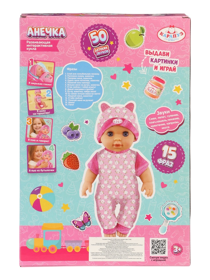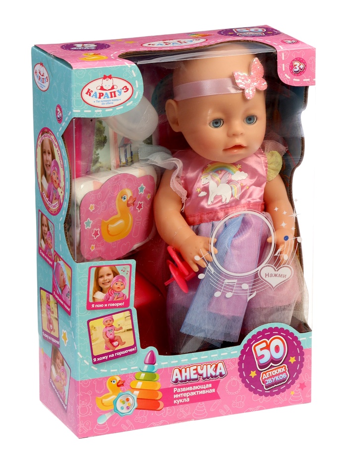 «Анечка» — это игровая кукла-малышка, с которой ребёнок может по-настоящему ухаживать и общаться. Она пьёт из бутылочки, ходит на горшок, закрывает глазки и озвучивает около 50 естественных детских звуков. Ребёнок пробует роль заботливого родителя, учится проявлять внимание и нежность, а игра становится понятной и близкой к реальной жизни. Кукла реагирует на действия: когда её укладывают, она закрывает глаза, когда поят из бутылочки — потом «писает», может смеяться, лепетать или хныкать. Звуки радости и недовольства помогают ребёнку лучше понимать эмоциональные реакции и вовлекаться в игру охотнее.