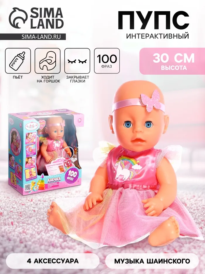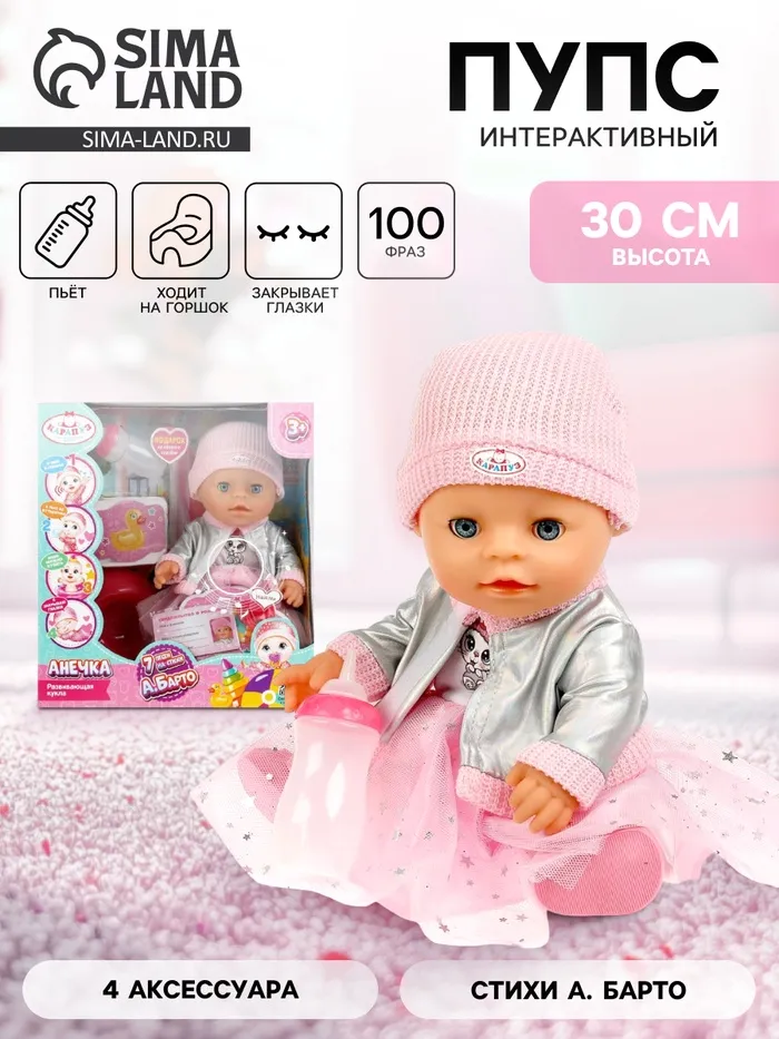 - Говорит 100 фраз — ребёнок сможет общаться с куклой и разыгрывать сценки.