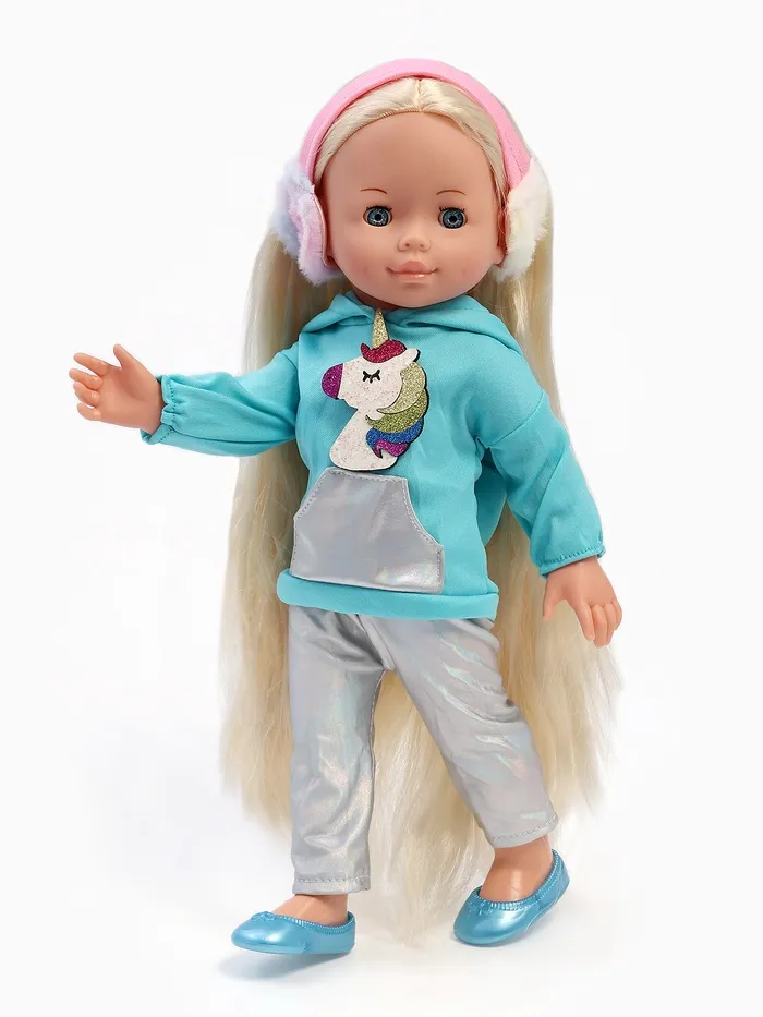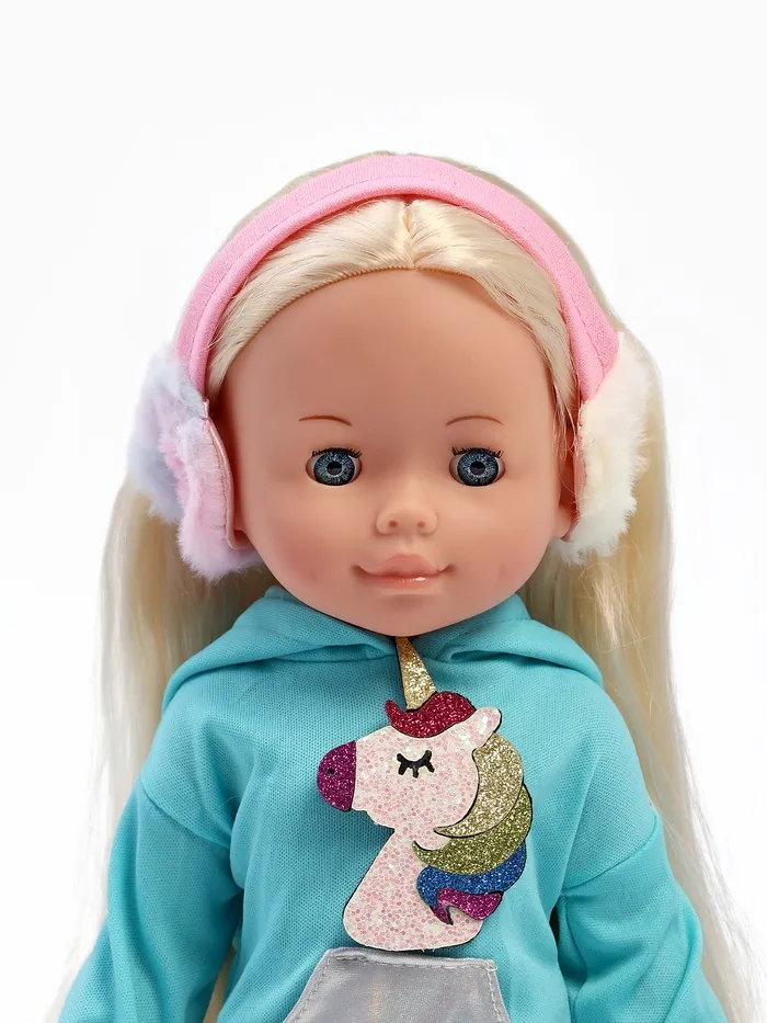 - Полина одета в яркую кофточку с аппликацией единорога и серебристые леггинсы. На голове у неё пушистые розовые наушники. Одежда легко снимается и надевается
