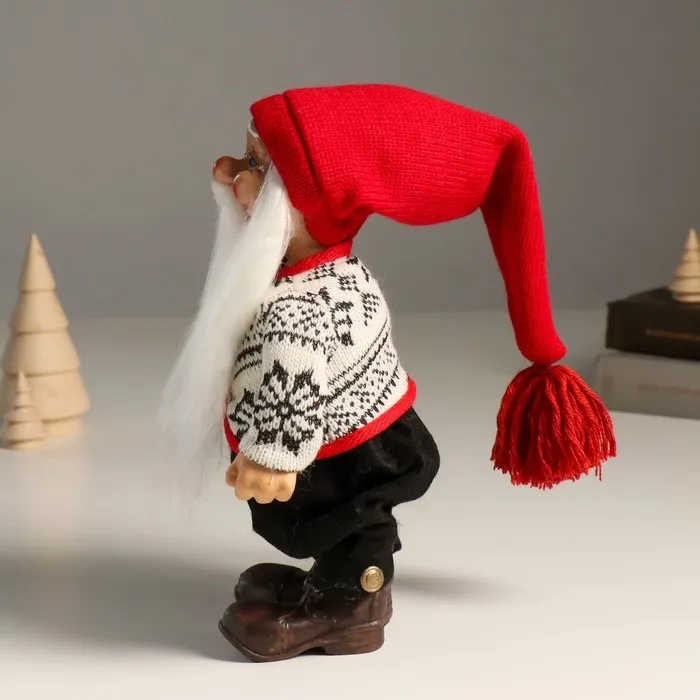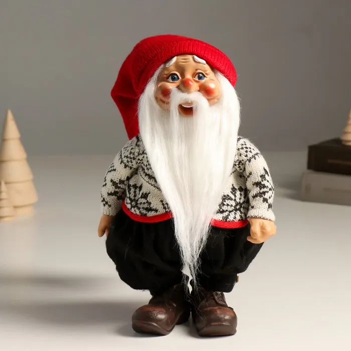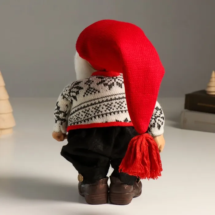 Кукла интерьерная текстильная «Дед Мороз в красном колпаке и вязаном свитером в узорах», 29 см — Характеристики