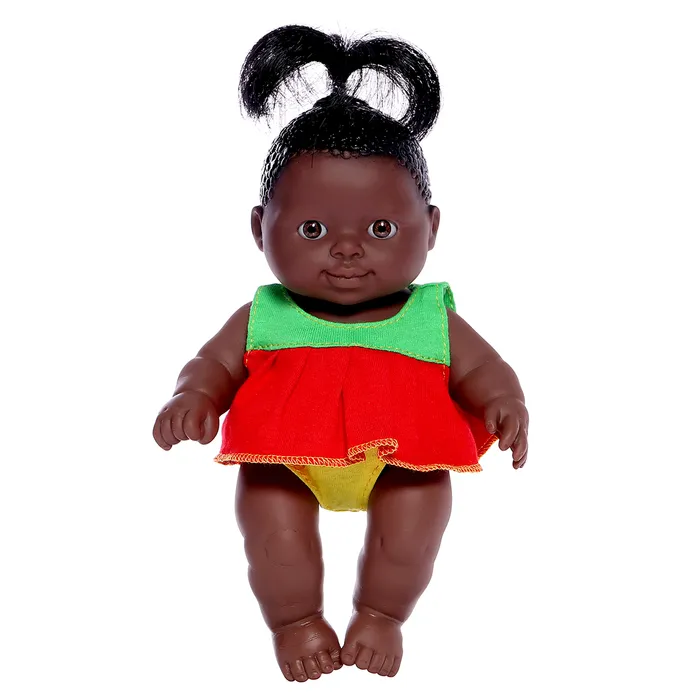 Кукла одета в платьице и трусики из бельевого трикотажа. В комплект одежды входит также трикотажная безрукавая футболка, штанишки и шапочка. Это позволит ребёнку разнообразить игровой процесс, развивая творческое воображение и мелкую моторику.