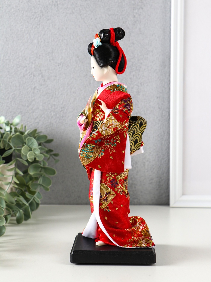 Кукла выполнена с невероятной точностью: её костюм сочетает яркие краски и изящные узоры, а веер в руках добавляет завершённости образу. Высота фигурки — 27 см, что делает её заметным акцентом в любой коллекции. Устойчивая подставка позволяет надёжно разместить куклу на полке или в стеклянной витрине.