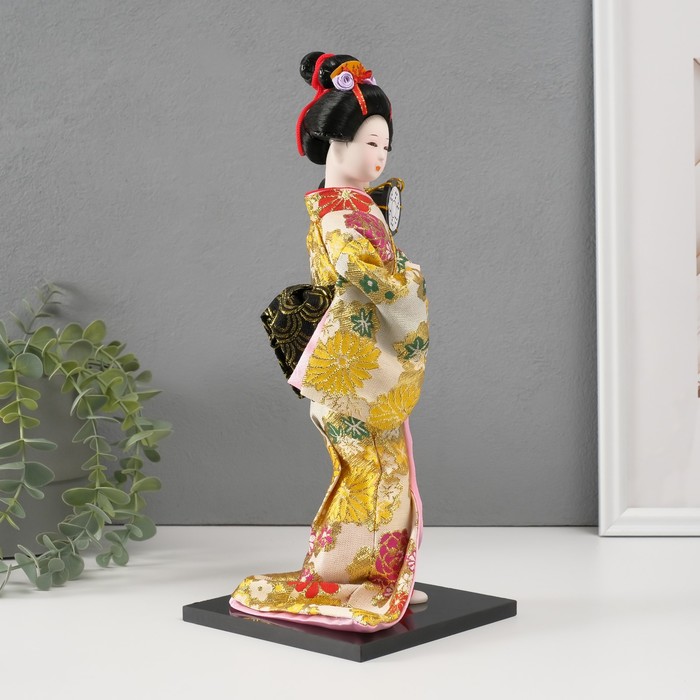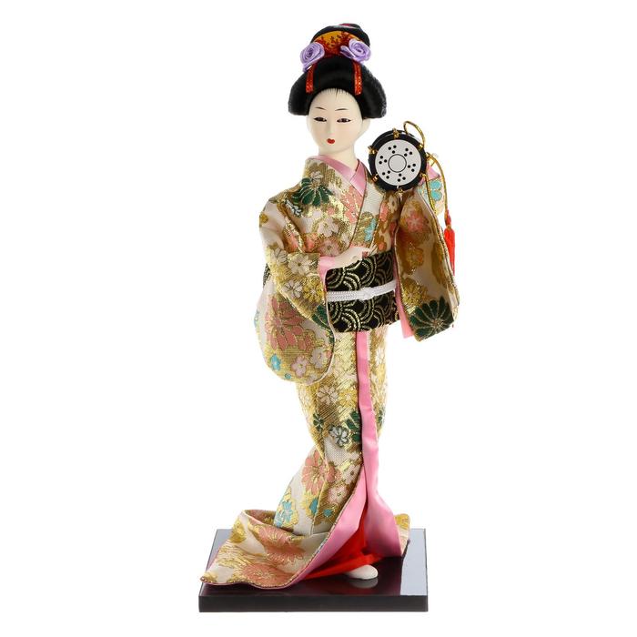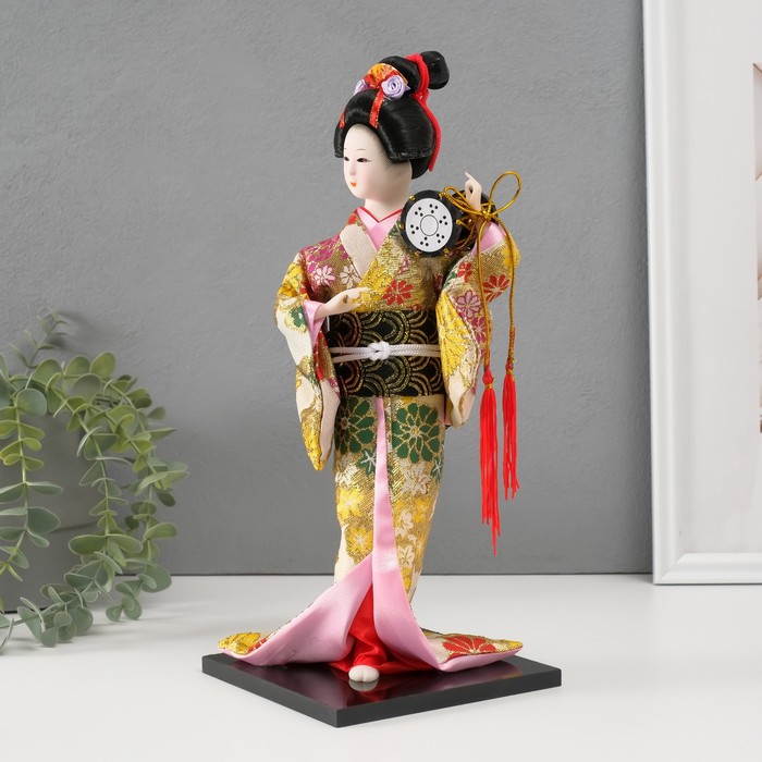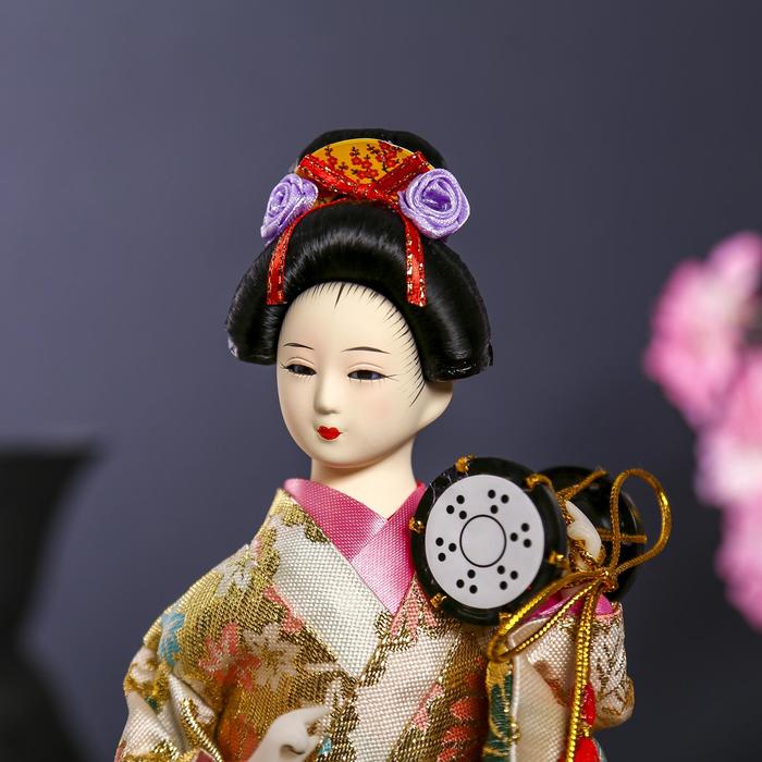 Кукла коллекционная «Гейша в шелковом кимоно с барабаном», 22.5 см пусть и не сможет поддержать беседу, спеть или станцевать, зато точно развеселит или даже удивит вас и ваших гостей. Вы только посмотрите на великолепное одеяние, причёску, позу, выражение лица... Авторам удалось передать всю прелесть и красоту этой японской дамы. Элегантное традиционное кимоно расшито цветной тканью: поистине ювелирная и кропотливая работа. Волосы собраны аккуратно и украшены маленькими, специально созданными для этой куколки аксессуарами. Мелкие детали — вот что ценят многие коллекционеры. Пусть эта красавица озаряет ваш интерьер своим присутствием изо дня в день.