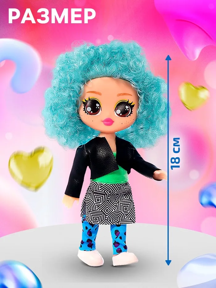 - Кукла высотой 18 см с кудрявыми голубыми локонами, которые можно расчёсывать и создавать стильные причёски.
