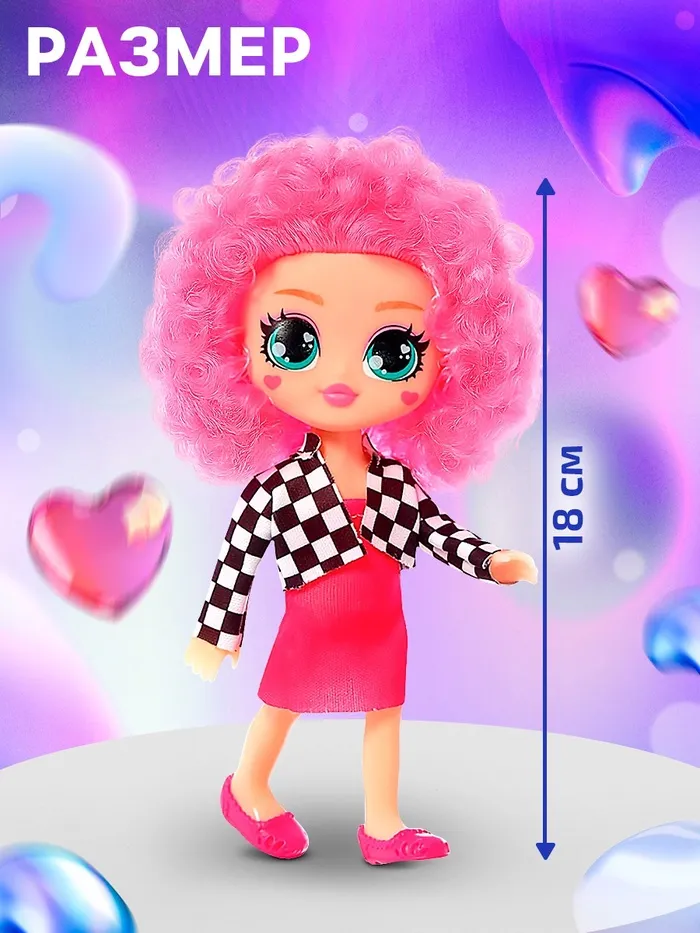 - Кукла высотой 18 см с кудрявыми ярко-розовыми локонами, которые можно расчёсывать и создавать стильные причёски.