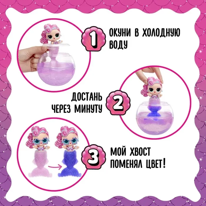Кукла-русалка из коллекции Mermaids меняет цвет хвоста при погружении в холодную воду! Используйте шар-набор в качестве аквариума: налейте ледяную воду, добавьте кубики льда, и кукла откроет вам удивительный сюрприз. Такой эффект добавляет элемент неожиданности и магии в игру.
