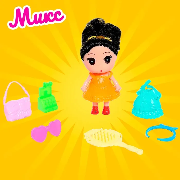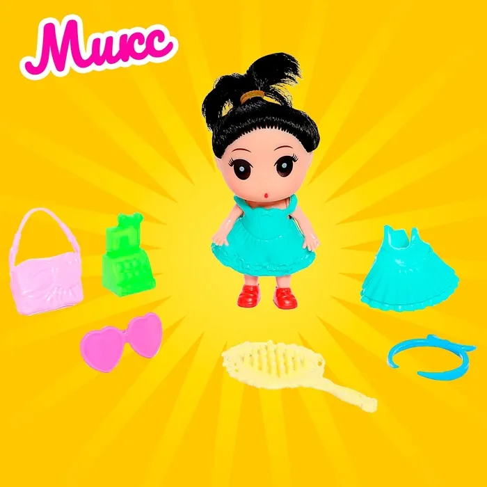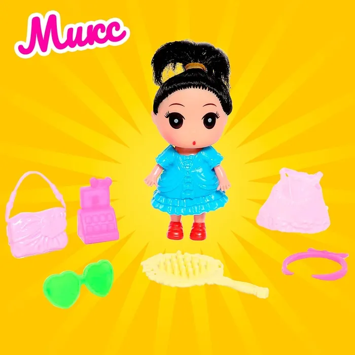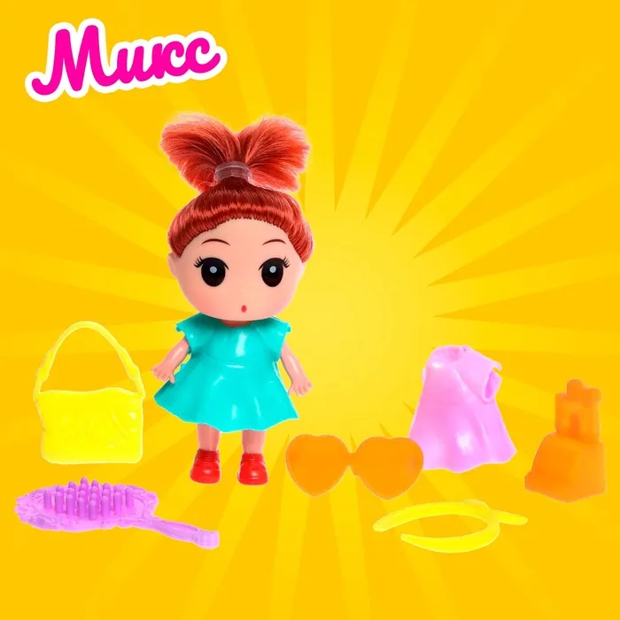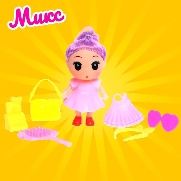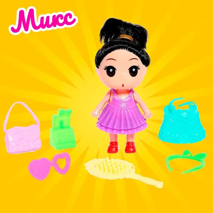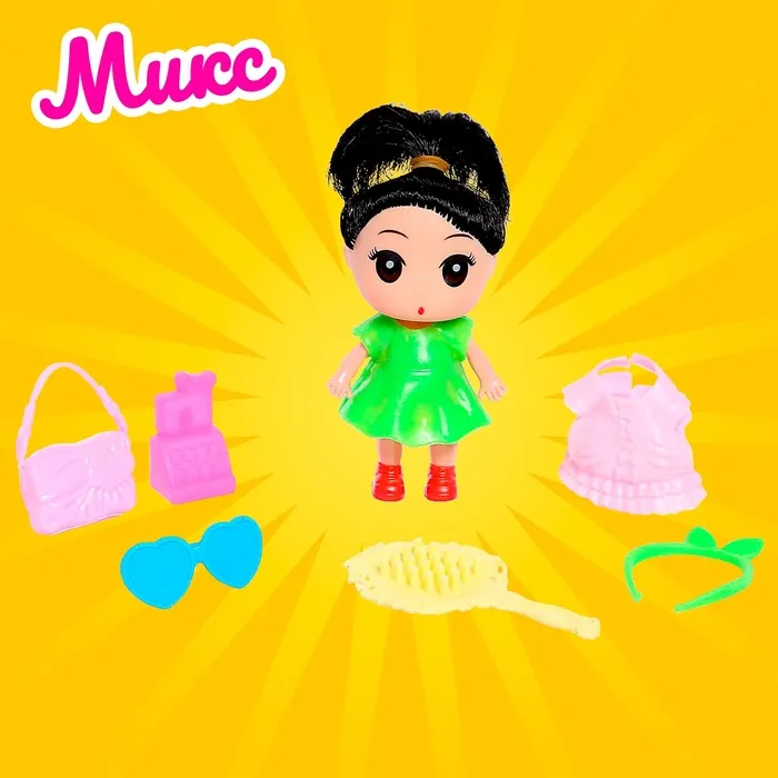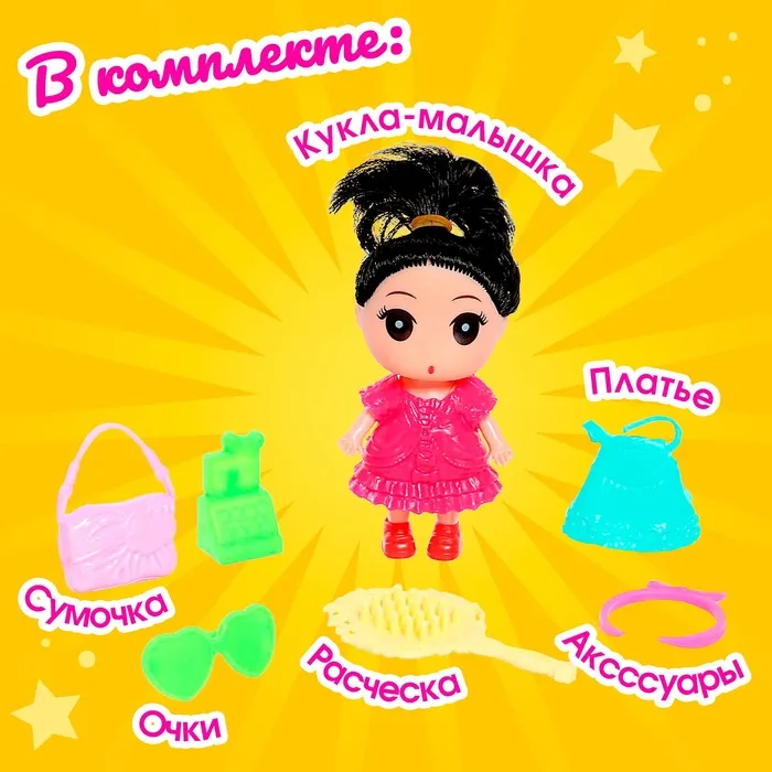 Высота куклы: 9 см. В комплекте платье, расчёска, сумочка и другие аксессуары.