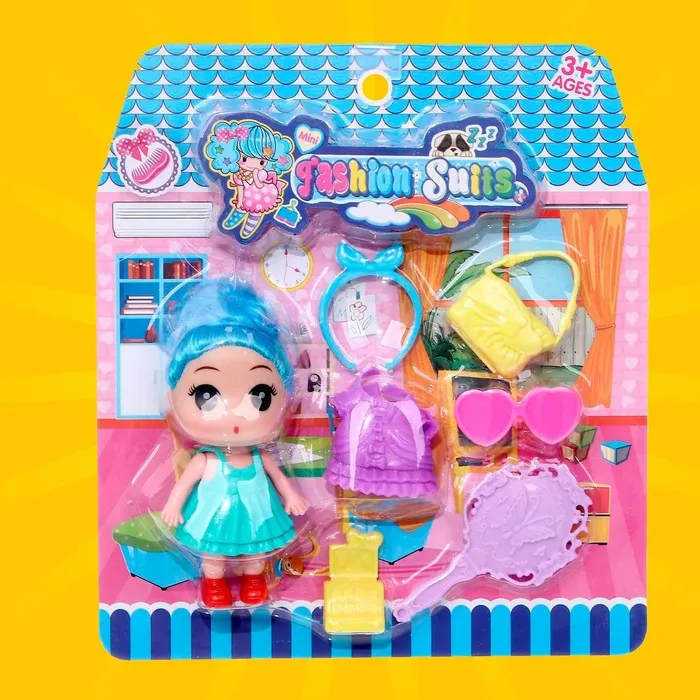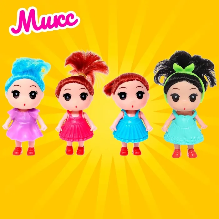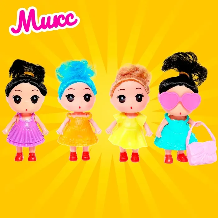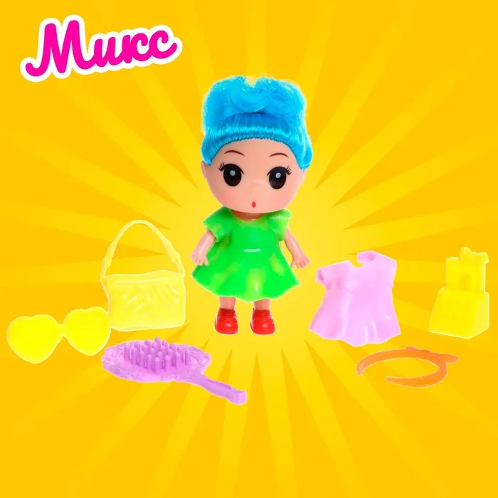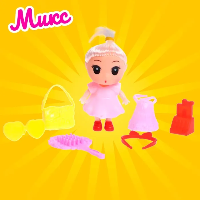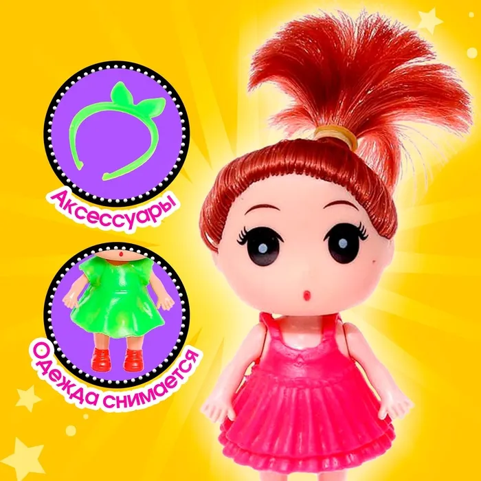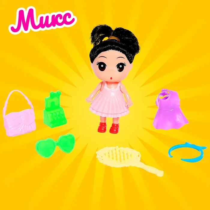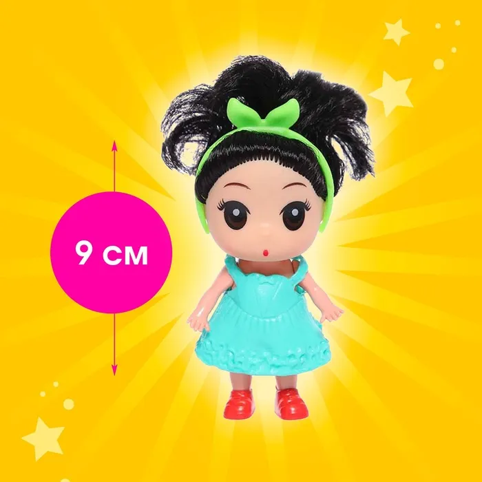 Высота куклы: 9 см. В комплекте платье, расчёска, сумочка и другие аксессуары.