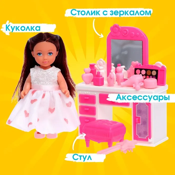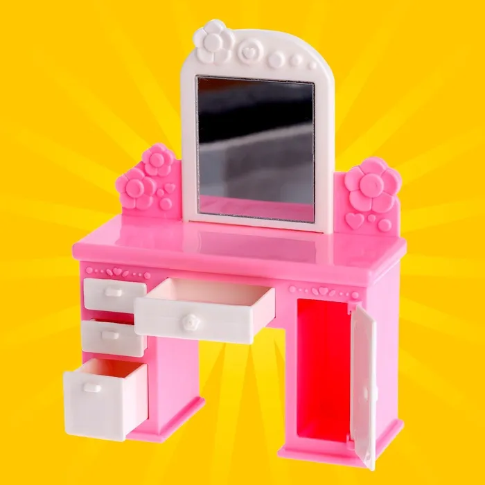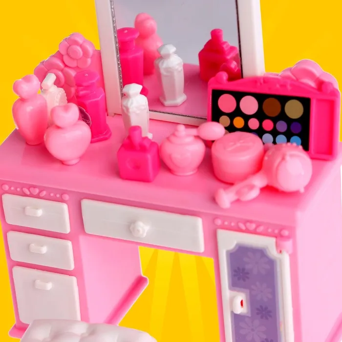 В комплекте уголок красоты. Он включает трельяж с зеркалом, стульчик, косметика, расчёска, фен.