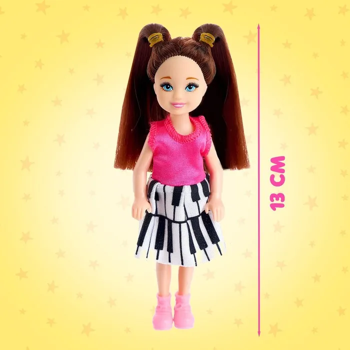Вика одета в очаровательное праздничное платье, которое делает её образ ещё более нежным и волшебным. Кукла небольшого размера — всего 13 см.