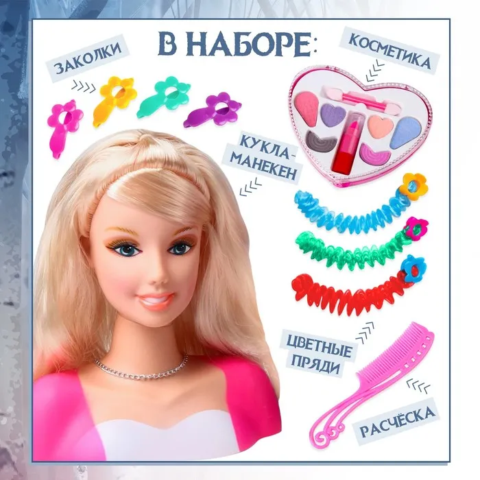- В наборе полный комплект аксессуаров: заколки, расчёска, цветные пряди и даже косметика. Все украшения подобраны в едином стиле, дополняют образ и помогают перевоплотиться в принцессу из сказки.