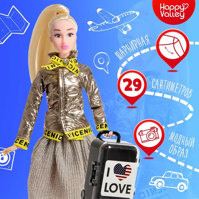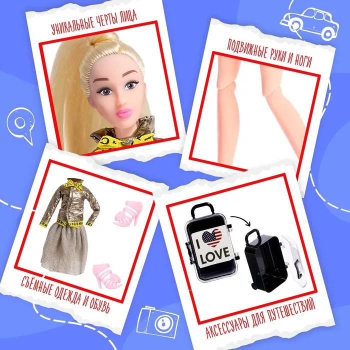 - В комплекте с куклой идут стильные аксессуары, которые помогут ей отправиться в путешествие по модным столицам мира. С их помощью вы сможете создавать новые образы и истории.
