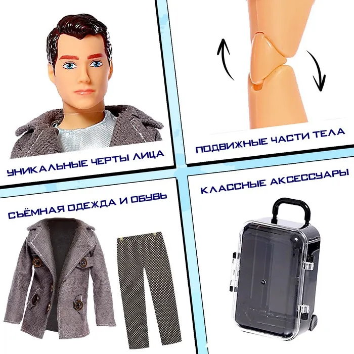 Ваша принцесса любит играть в куклы и путешествовать? Тогда эта кукла-модель станет эффектным подарком для неё! Этот красавчик составит отличную компанию в путешествиях и станет лучшим другом для куколки вашего ребёнка, а может быть, и женихом!