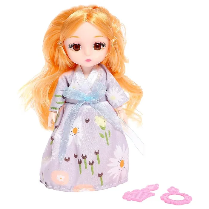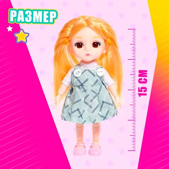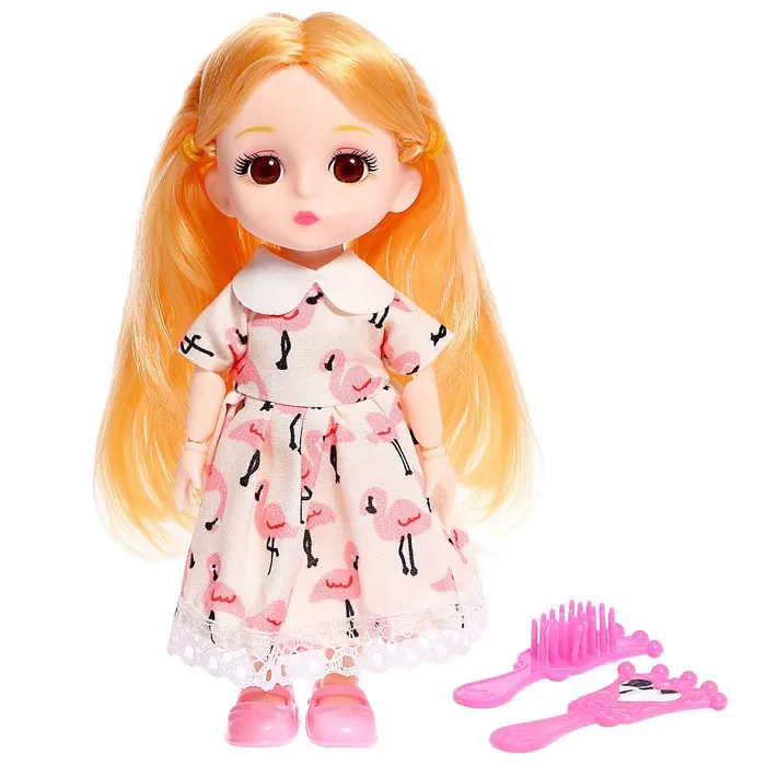 Кукла шарнирная полностью, высота — 15 см. В комплекте расчёска и зеркальце.