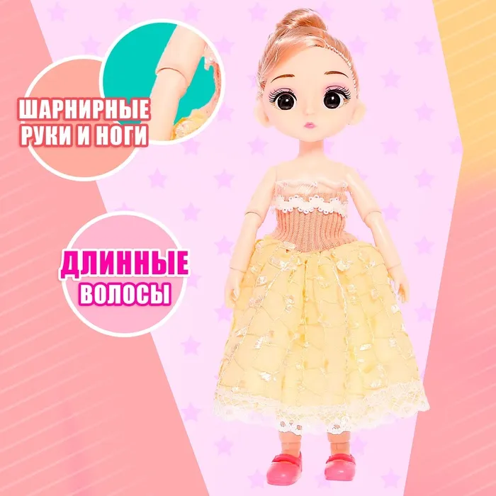 - Туфельки и платье снимаются. Ребёнок сможет придумать для куколки новые наряды.