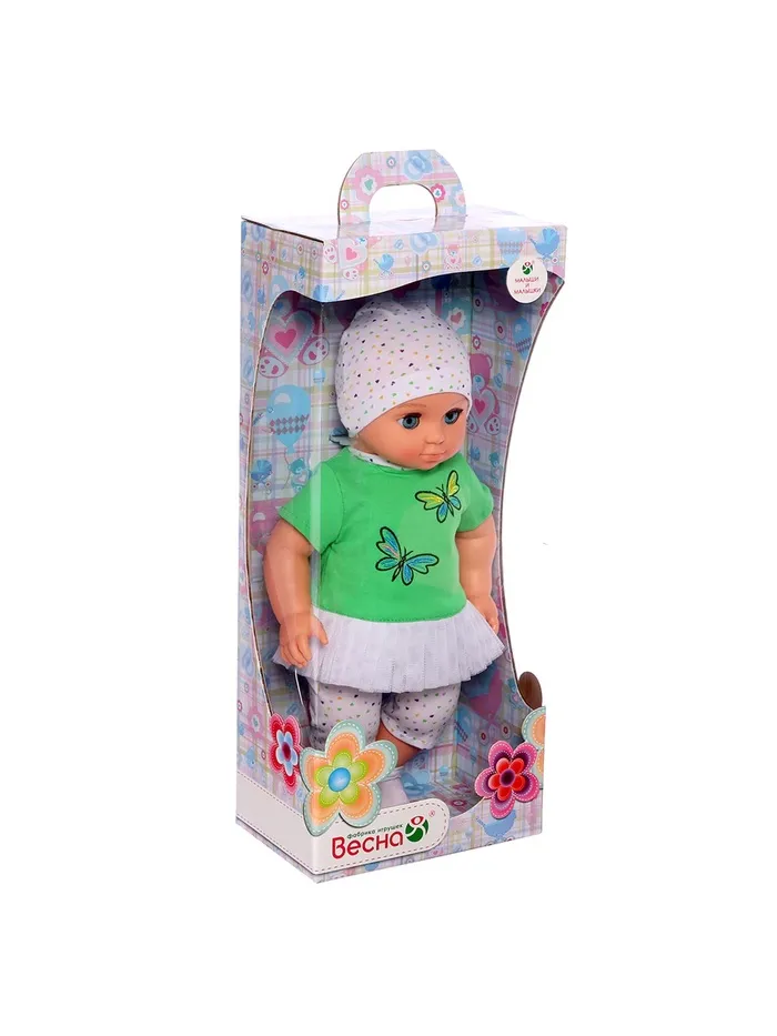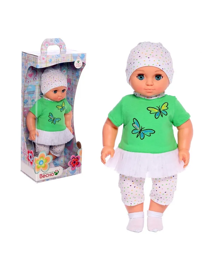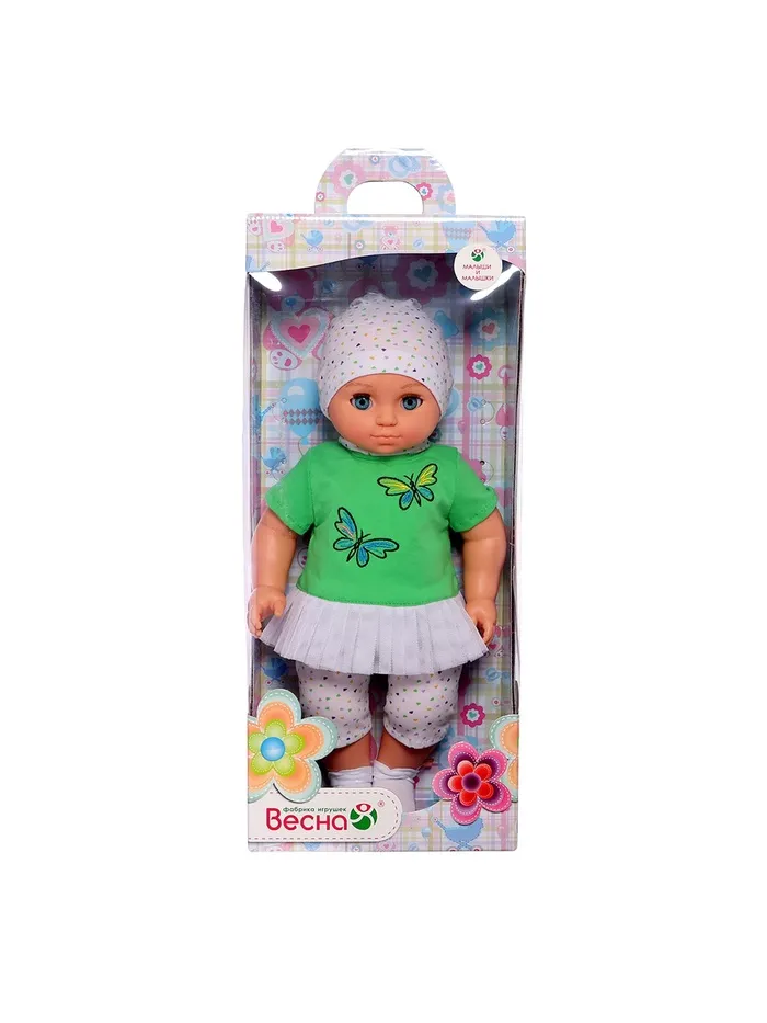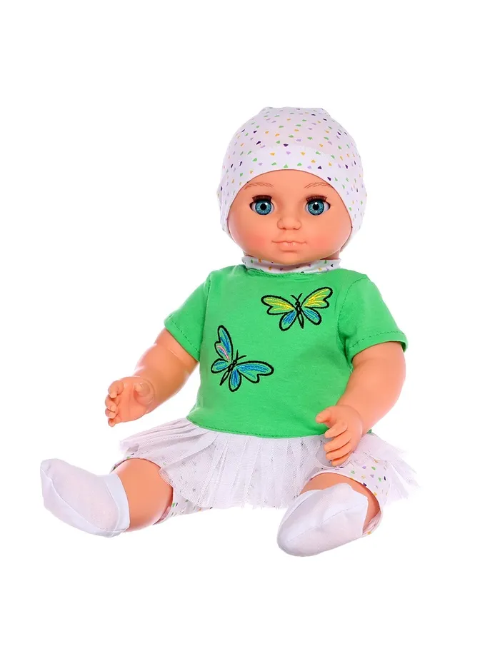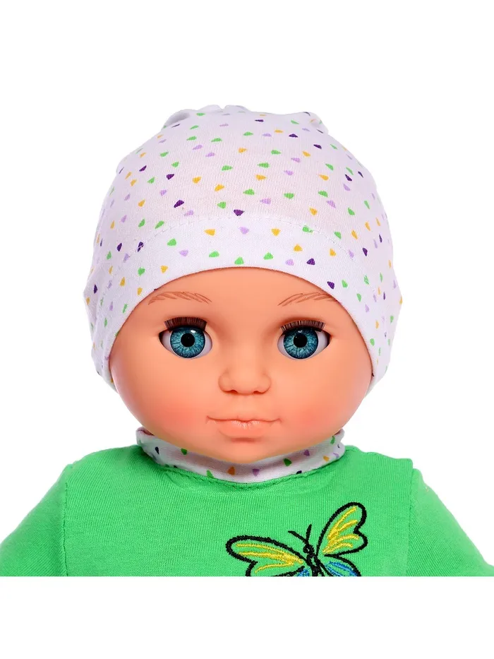 Кукла «Пупс 14» очень реалистична и похожа на настоящего ребёнка. В комплект входит трикотажная однотонная туника с короткими рукавами. Туника имеет обтачку горловины из цветного трикотажа, а также оборку по низу из мягкой сетки. Застегивается туника сзади на контактную ленту и на передней части имеет вышивку «Бабочки». В комплект также входят трикотажные разноцветные бриджи длиной чуть ниже колена, шапочка с отворотом и трикотажные носочки.