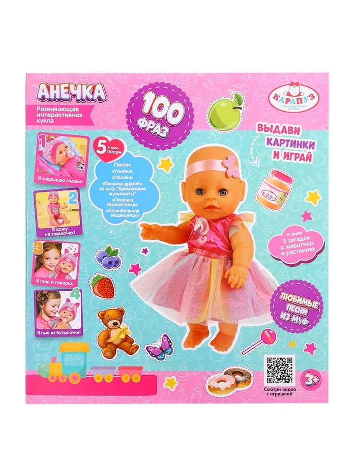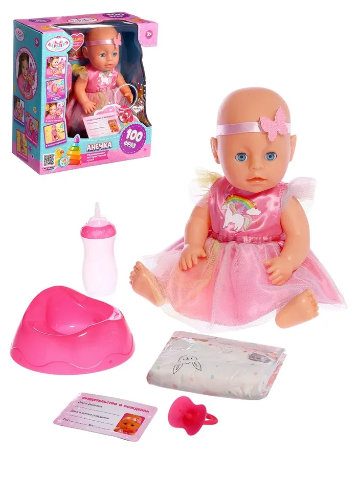 Кукла - пупс интерактивная «Анечка», 30 см, говорит 100 фраз, музыка Шаинского, пьёт, писает, закрывает глазки, 4 аксессуара — Характеристики