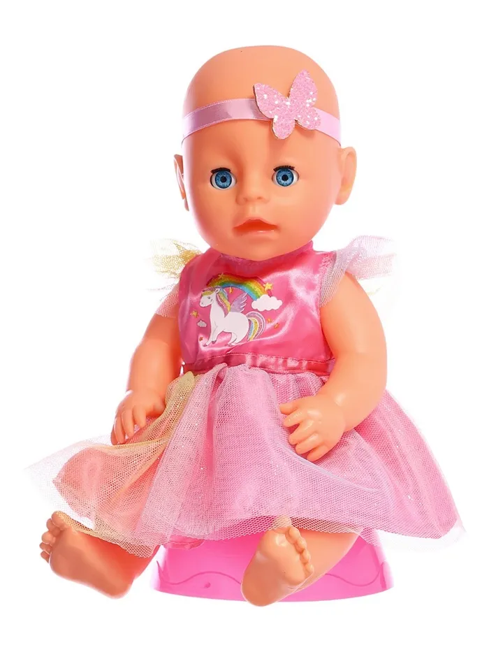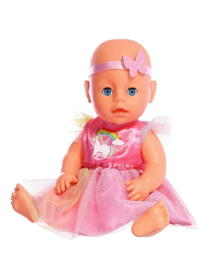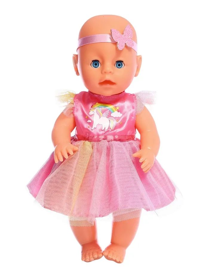 - Кукла в ярком платье с единорогом и нежной повязке на голову.
