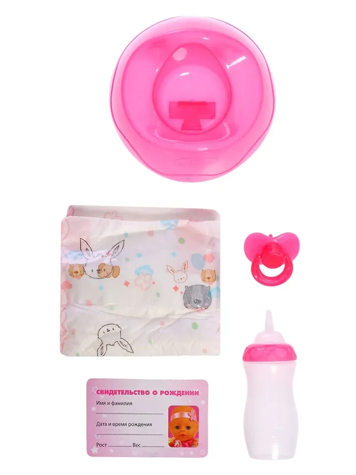 - Бутылочка, соска, подгузник и горшок — для заботливых игр.