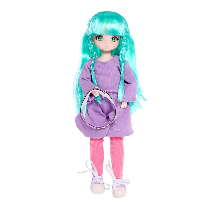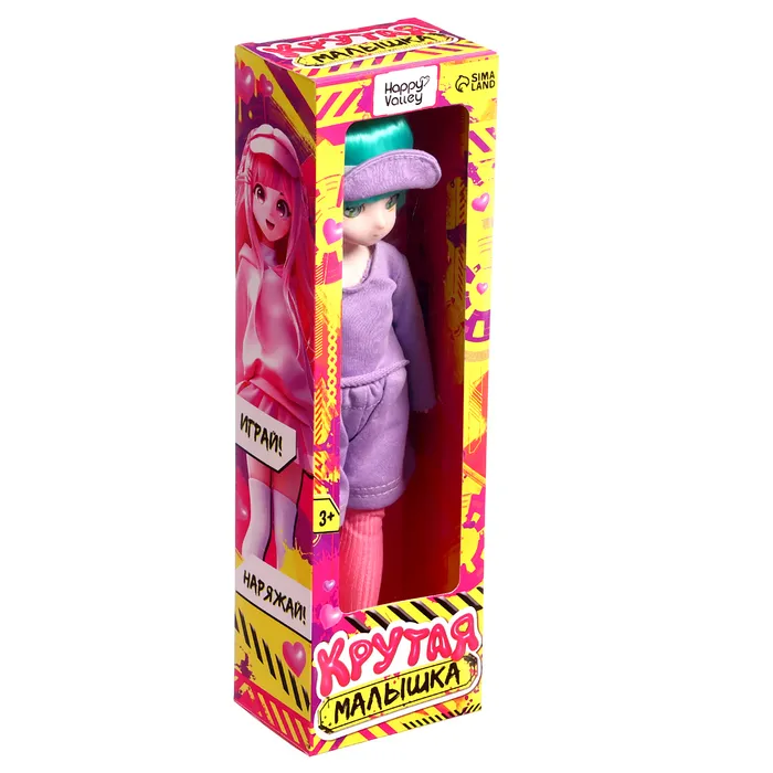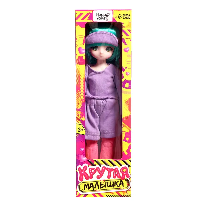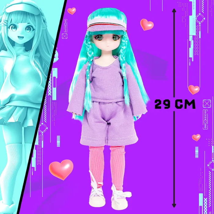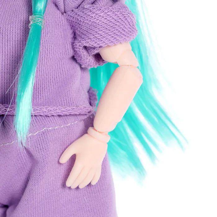 - Стильный козырёк на голове и сиреневые кеды дополняют её образ, делая куклу ещё более модной и современной