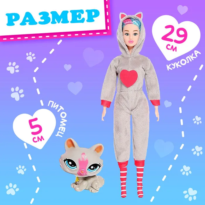 - Высота куклы — 29 см, питомца — 5 см.