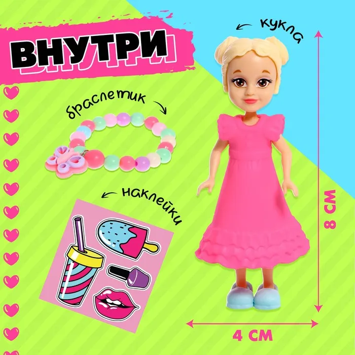 Игрушка-сюрприз в шаре — это увлекательное развлечение для детей, которое принесёт много радости и веселья. Внутри шара спрятана маленькая кукла и браслет, что добавляет элемент неожиданности и интриги.