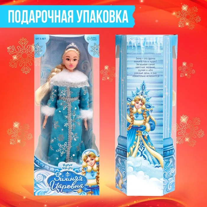 Ваша малышка не знает, как передать пожелания Деду Морозу? Тогда «Зимняя царевна» в костюме Снегурочки поможет ей в этом и станет эффектным подарком на Новый Год! Вместе с «Зимней царевной» ребёнок загадает желание Деду Морозу, отметит новогодние праздники или проведёт сказочный утренник для родителей. Игрушка упакована в красочную коробочку, поэтому её можно вручить в подарок даже без дополнительного праздничного оформления.