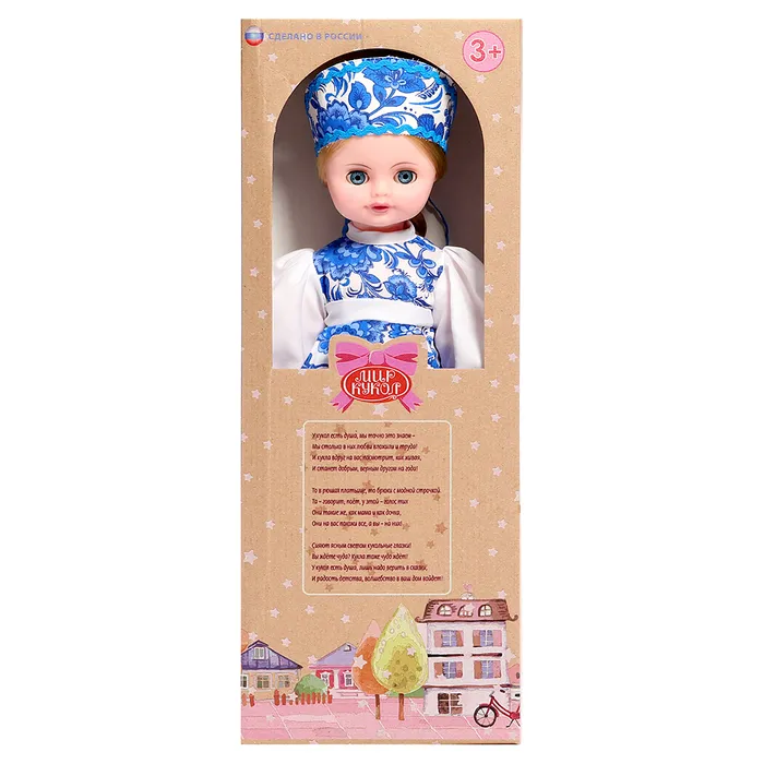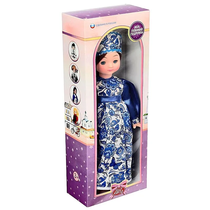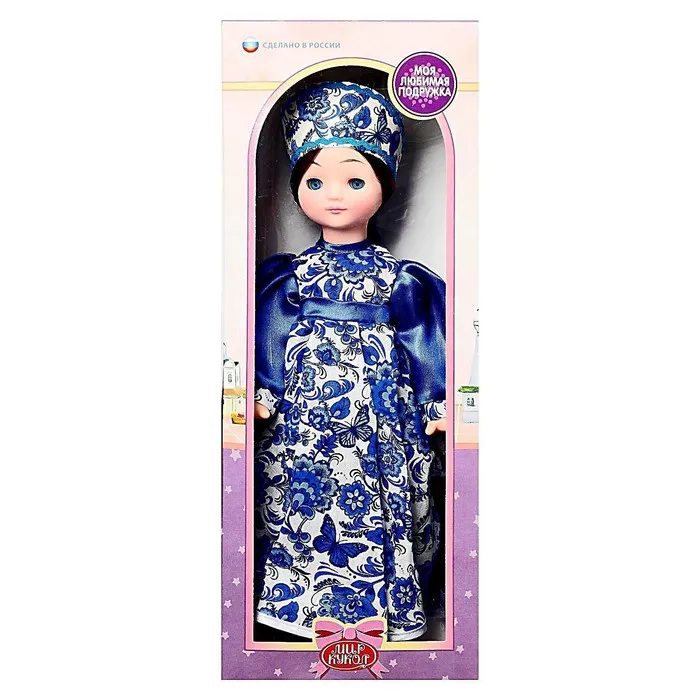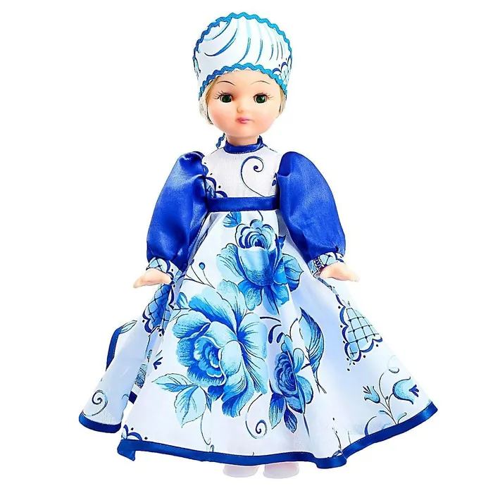 Кукла «Василина» в русском платье, украшенном эффектными гжельскими узорами, очарует любую девочку. Погрузитесь в удивительный мир народной культуры России с помощью этой куклы!