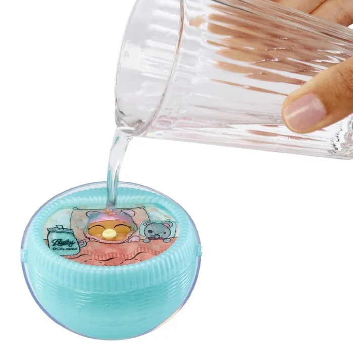 - Эти малыши крепко спят в своей колыбельке, но вы можете разбудить их с помощью воды! Просто потрите закрытые глазки куклы влажной тканью, и она откроет глазки!