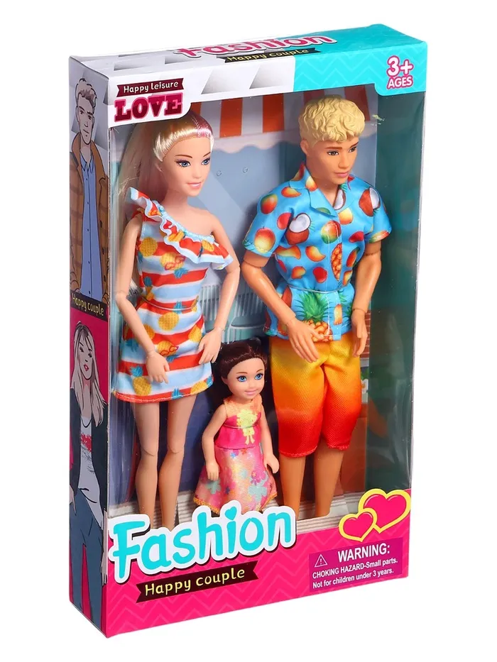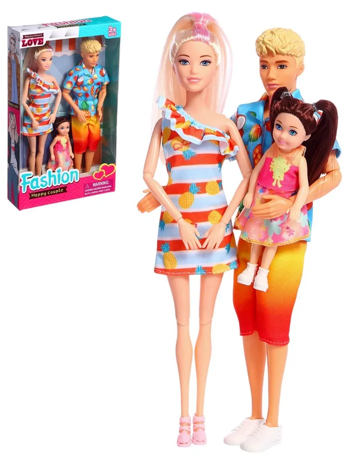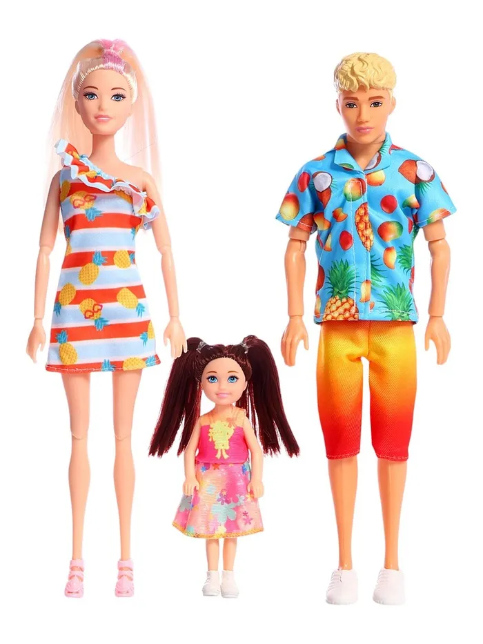 - В набор входят три куклы: мама — 30 см, папа — 29 см, дочка — 13,5 см.