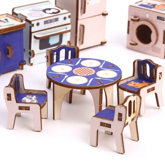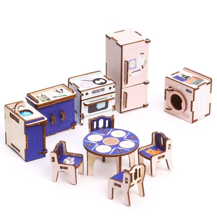 Создайте уютную кухню для кукольного домика с этим набором деревянной мебели. Комплект включает кухонный гарнитур, столы и стулья, выполненные в ярких разноцветных оттенках. Изделия из натурального дерева выглядят реалистично и станут прекрасным дополнением для игр или декора детской комнаты.