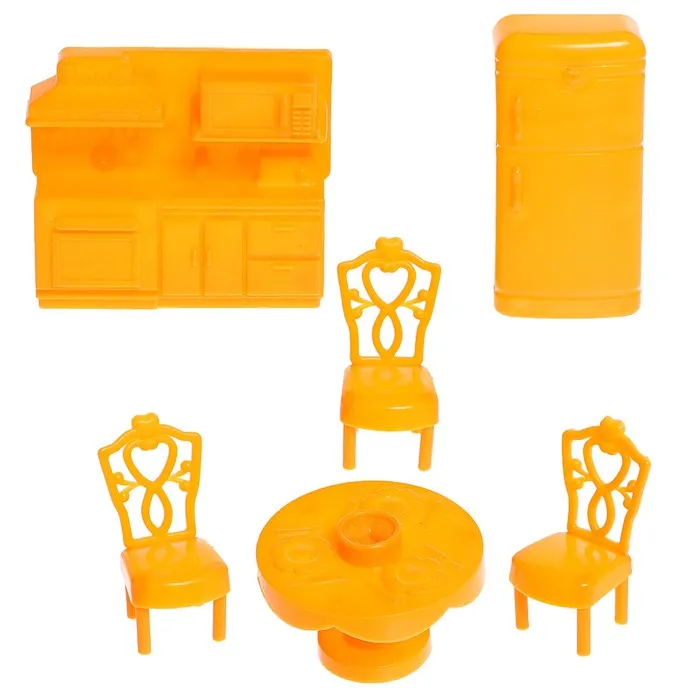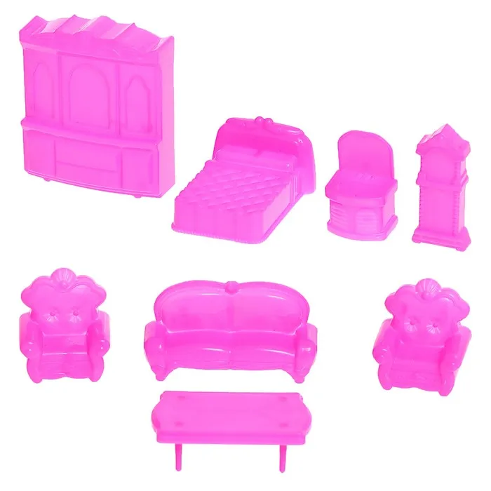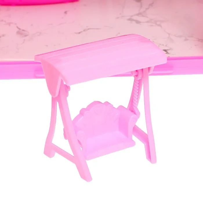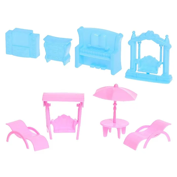 - В комплекте мебель и другие предметы: музыкальная станция, комод, пианино, качели розовые (качаются), качели голубые (не качаются), лежаки, стол с зонтом, кухонный гарнитур, холодильник, обеденный стол, стулья, шкаф, кровать, раковина, кресла, диван, журнальный столик, часы.