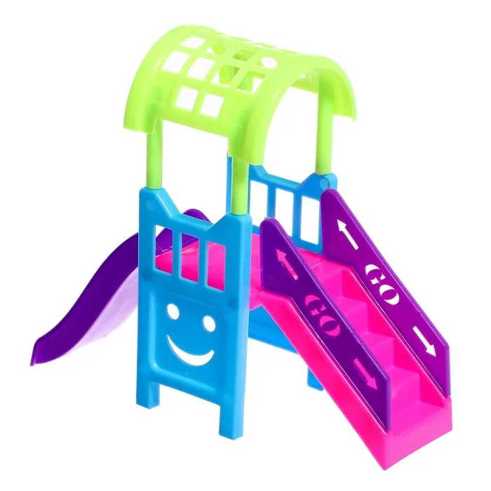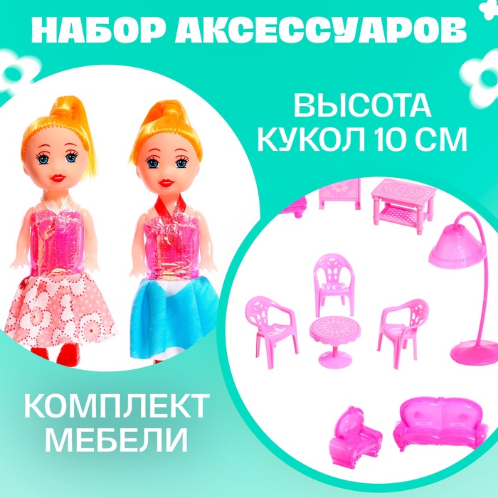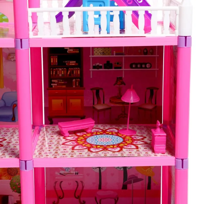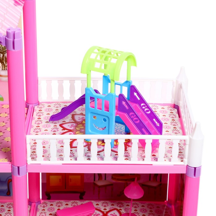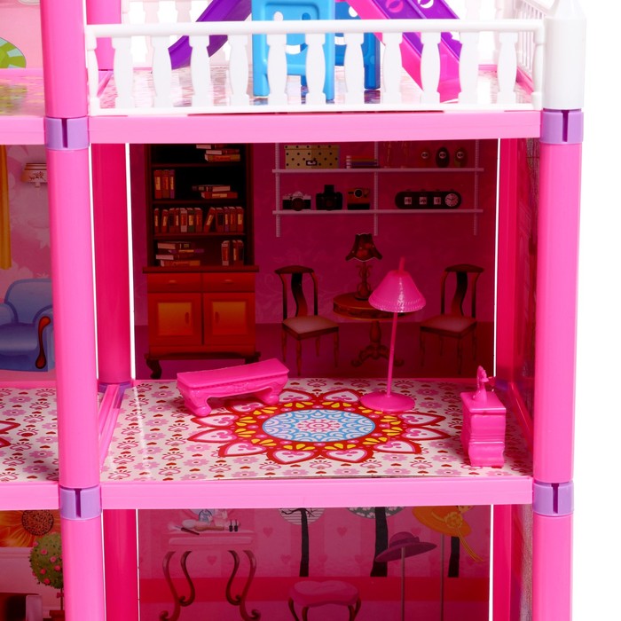 Размер домика: 60 × 18 × 57 см. Подходит для кукол высотой до 15 см. Мебель входит в комплект.