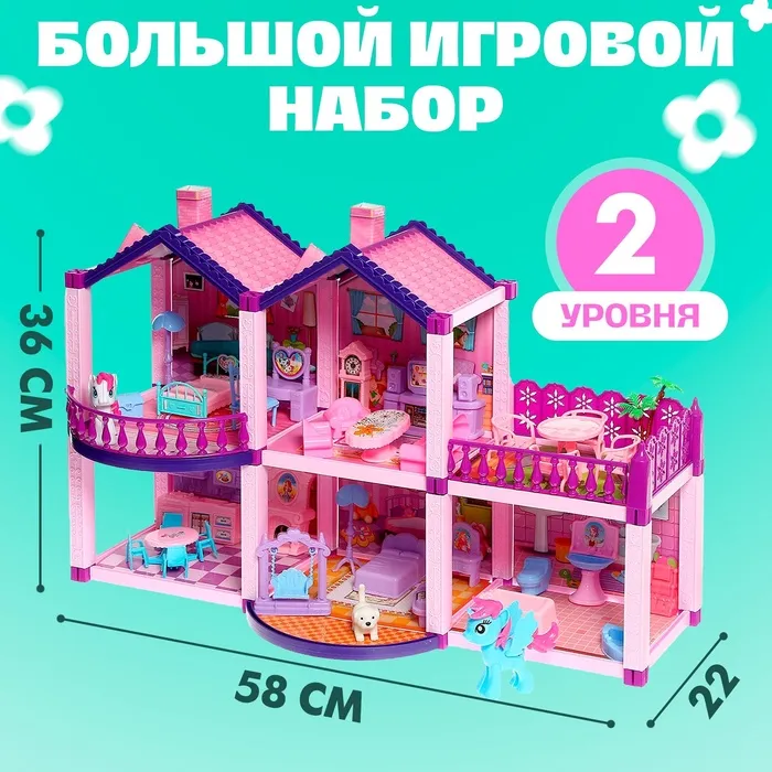 Размер дома: 58 × 22 × 36 см. Подходит для кукол до 10 см.