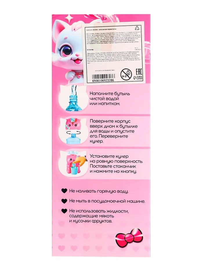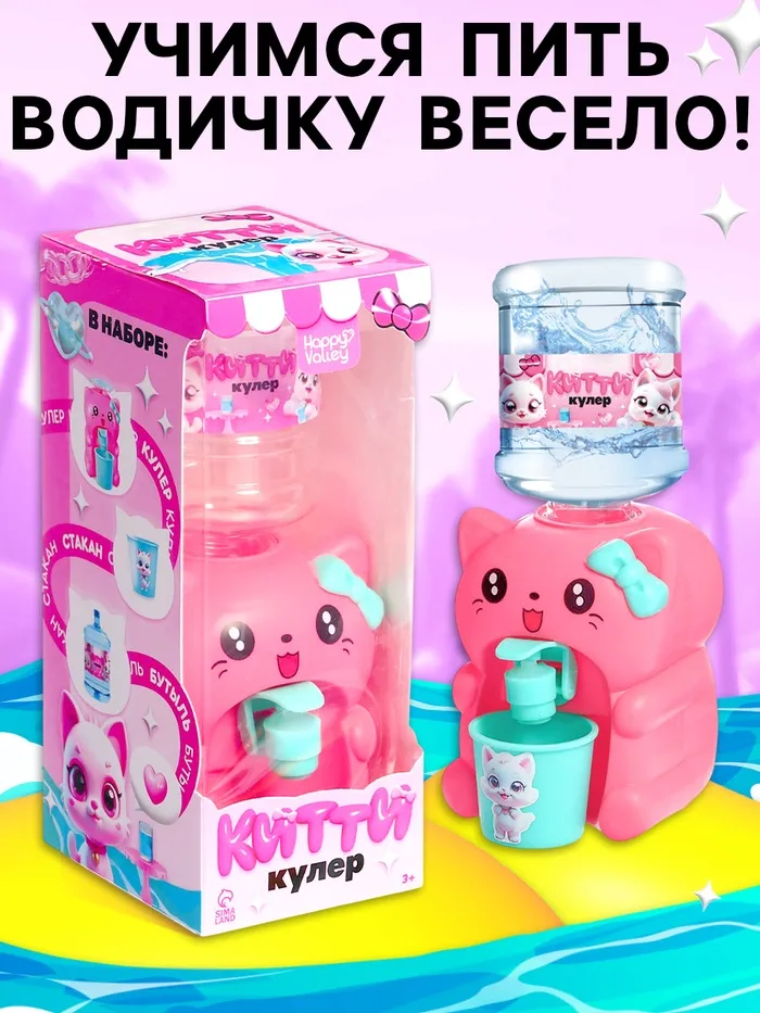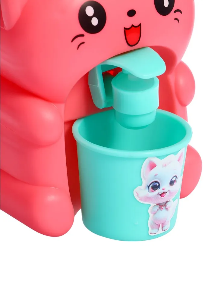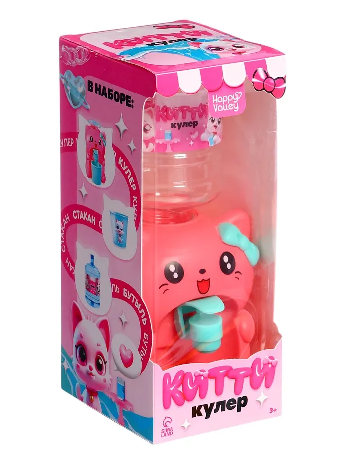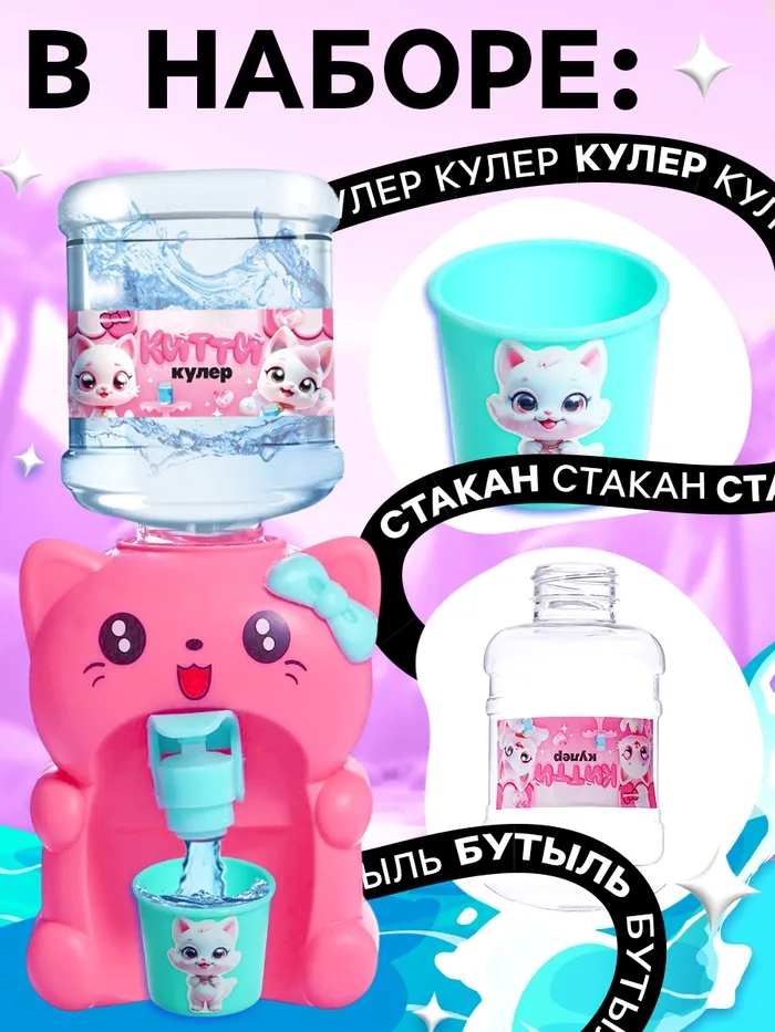 Кулер для воды «Китти» с небольшим резервуаром дополнит интерьер игрушечной кухни маленькой хозяюшки, сделает игровые сюжеты более реалистичными.