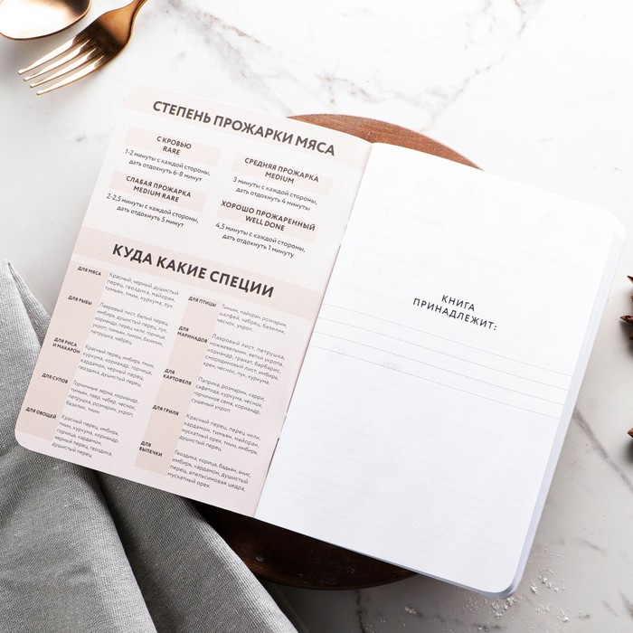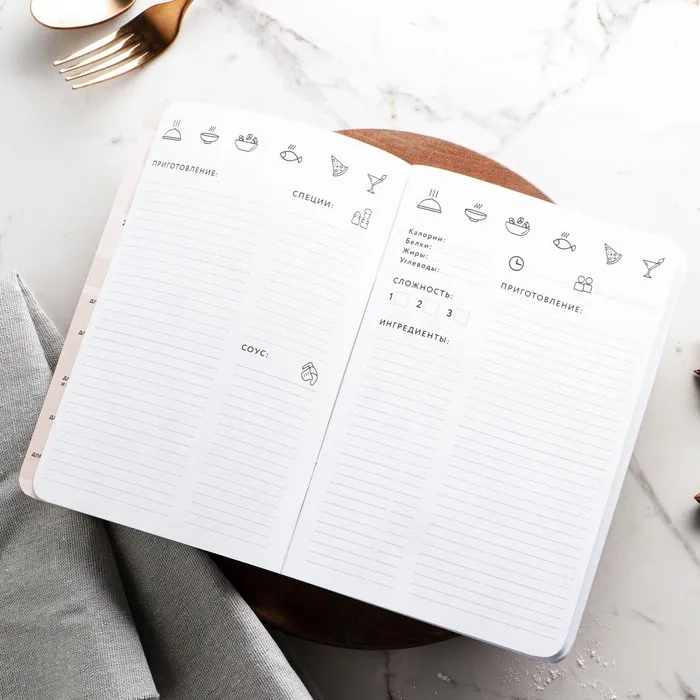 Блокнот для записи рецептов - Отличный помощник на кухне, он всегда будет под рукой, в отличие от любых электронных аналогов. Записи позволят не забыть про удачный рецепт, который снова захотите повторить. Для удобства использования, вы можете отмечать сложность, время приготовления, где готовится и количество порций, для каждого рецепта, а так же записывать весь процесс приготовления. А универсальный формат, не займет много места на вашей кухне.
