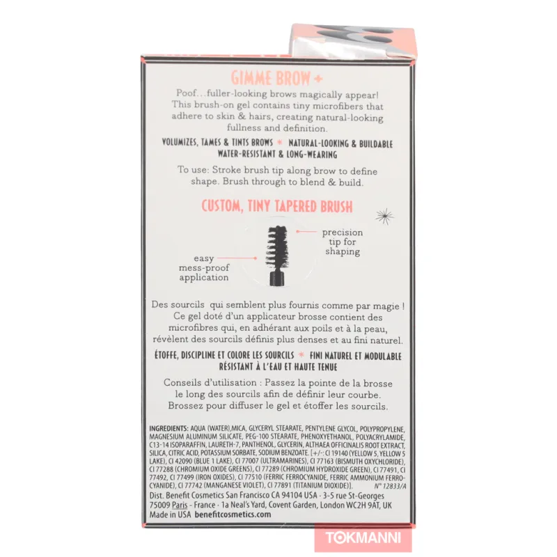 Гель для бровей Benefit Gimme Brow обладает уникальной волокнистой текстурой, которая помогает заполнить и придать объем даже самым тонким бровям. Этот продукт идеально подходит для тех, кто хочет добиться плотности и естественности. Формула на основе волокон обеспечивает стойкость в течение всего дня.