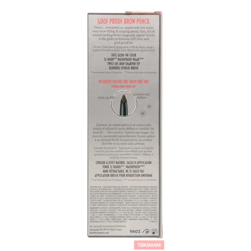 Карандаш для бровей Benefit Goof Proof - это ваш идеальный помощник для создания безупречных бровей. Водостойкая формула обеспечивает длительное ношение до 12 часов. Легко наносится и подходит для быстрого и точного использования.