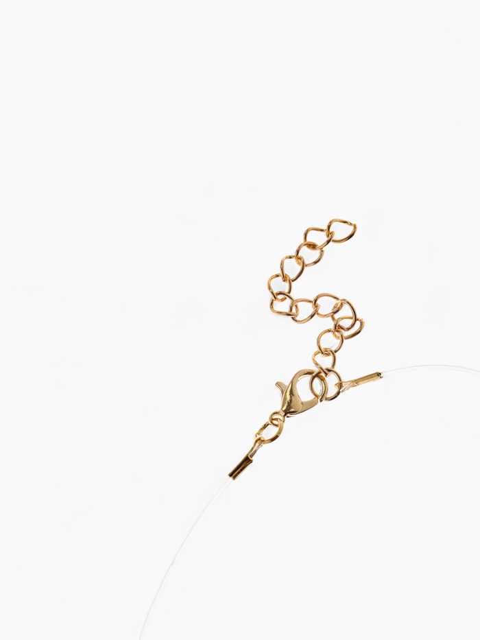 Искусственный камень полистоун в золотистой оправе гармонично сочетается с тонкой леской, создавая ощущение лёгкости и изящества. Такой дизайн подчёркивает индивидуальность и дарит возможность выделиться без лишних деталей.