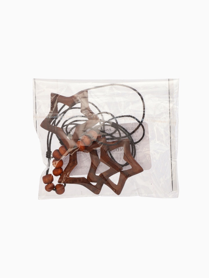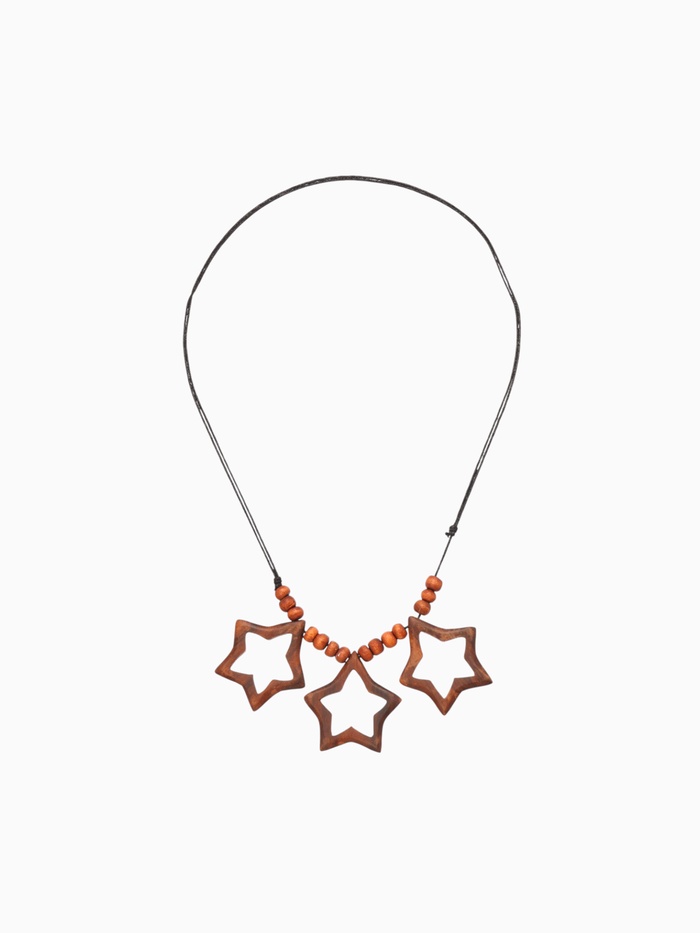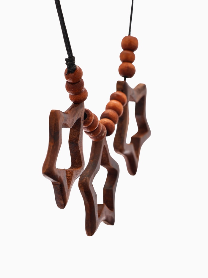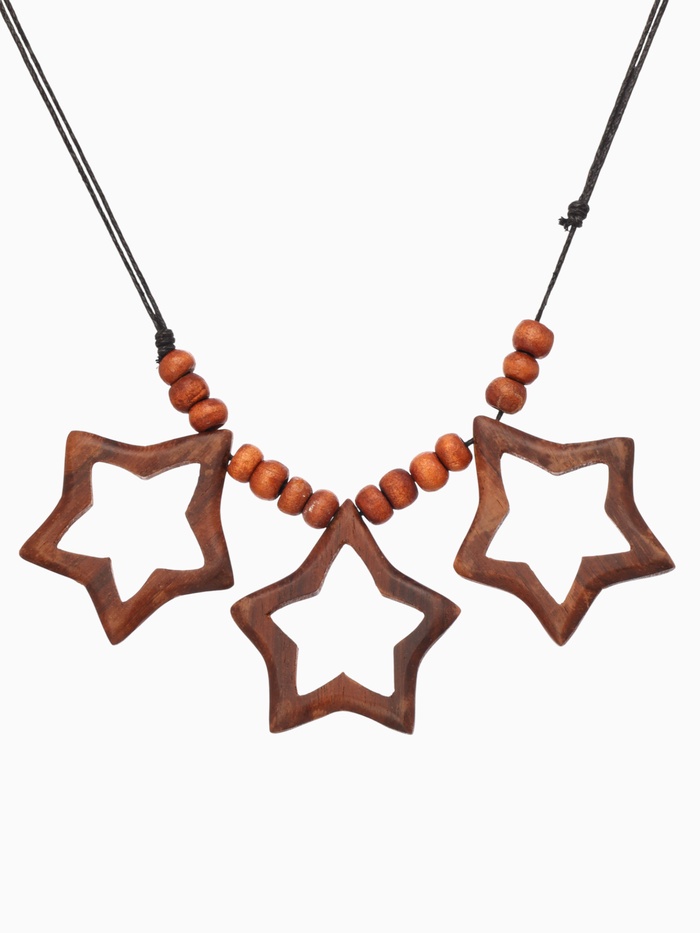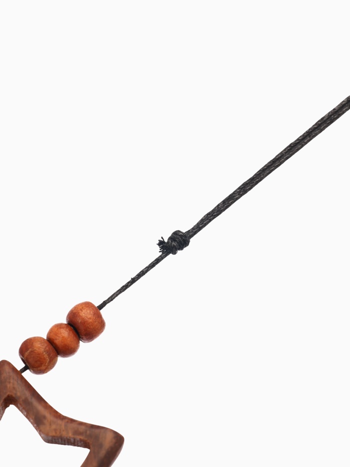 Женщина, ищущая необычный аксессуар, оценит этот изящный кулон с этническими нотками. Украшение выполнено из благородного дерева и дополнено основой из искусственной кожи, обеспечивающей удобство носки. Уникальный дизайн воплощён в образе трёх звёзд, символизирующих загадочность и очарование ночной вселенной.