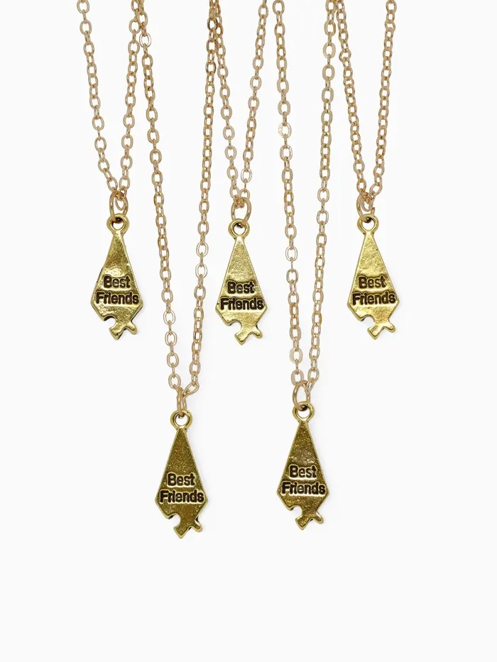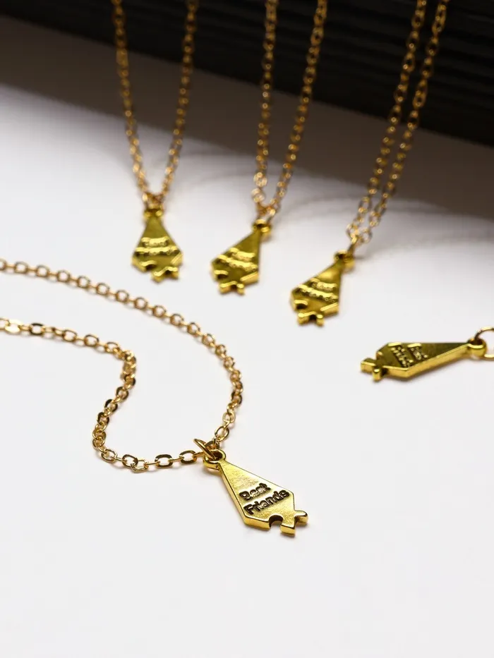 Набор золотистых кулонов-неразлучников с пятью пазлами — это символ связи и единства, который подойдет для подарка на 14 февраля, 8 марта, день рождения или любой другой праздник. В комплект входит пять одинаковых кулонов на цепочке длиной 45 см, выполненных из металла с золотистым покрытием, что делает их универсальным украшением для мужчин и женщин.