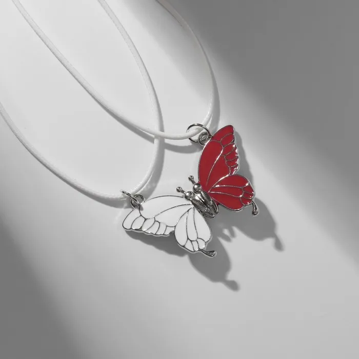 Кулоны парные «Неразлучники» на магните, бабочка яркая, бело-красные в серебре, 45 см