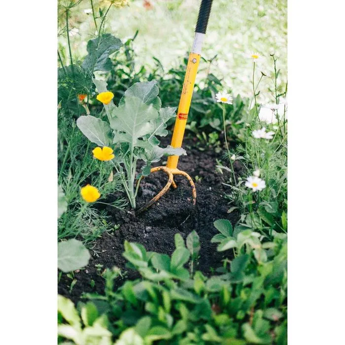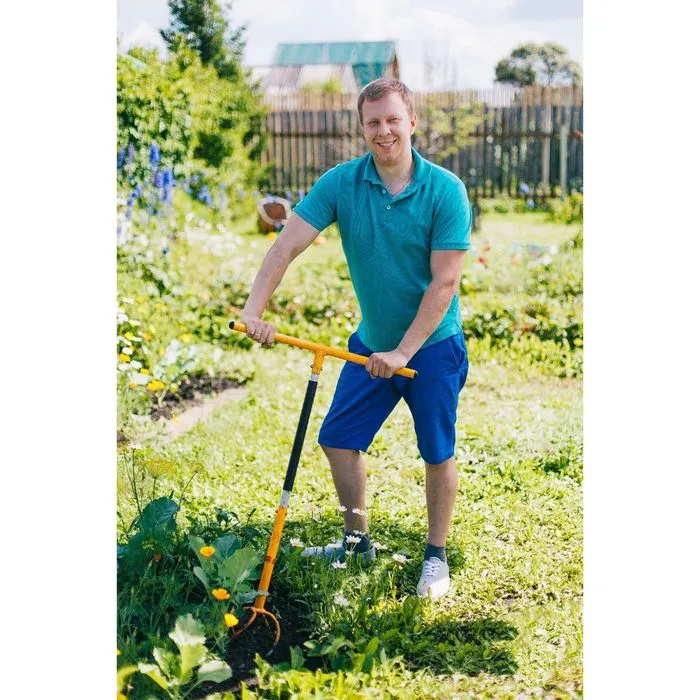 Поставьте инструмент вертикально, проверните и потяните вверх. Острые спиралевидные зубцы из закалённой стали врежутся в землю подобно штопору, разрыхлят даже тяжёлую твёрдую землю и вытянут корни сорняков на поверхность.