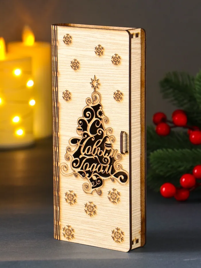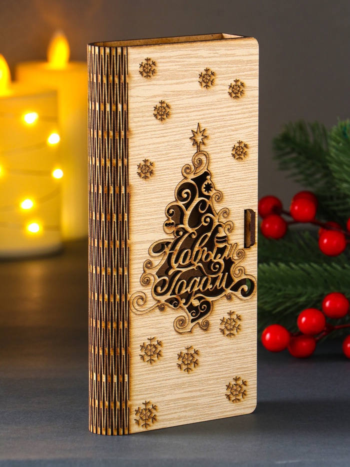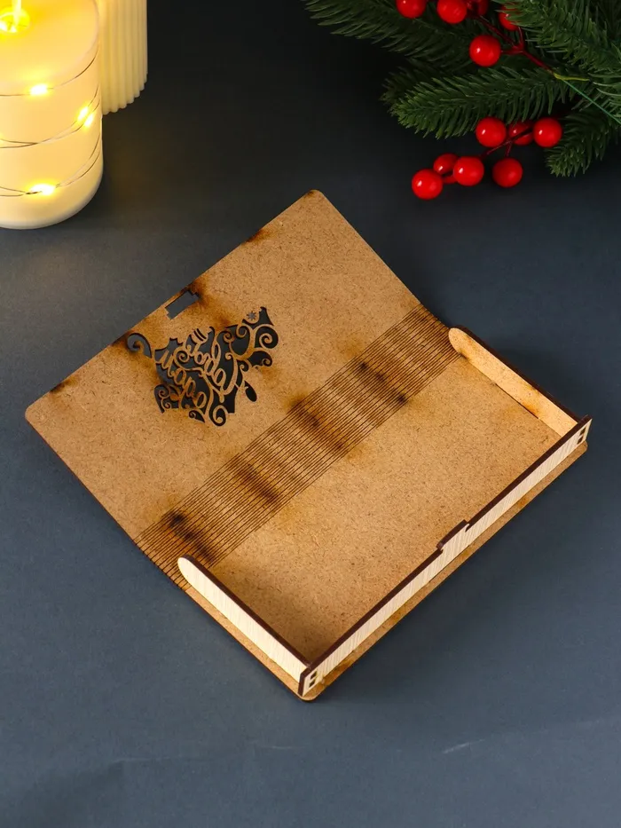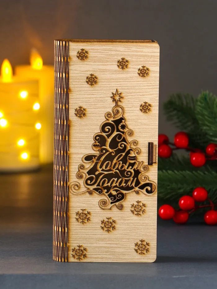 - Стильный формат книги из прочного ХДФ, обтянутого качественной бумагой с новогодним принтом.