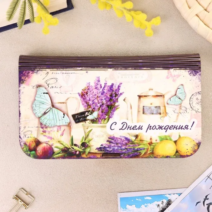 Купюрница "С Днём рождения!", бабочки и цветы, фиолетовая — Характеристики