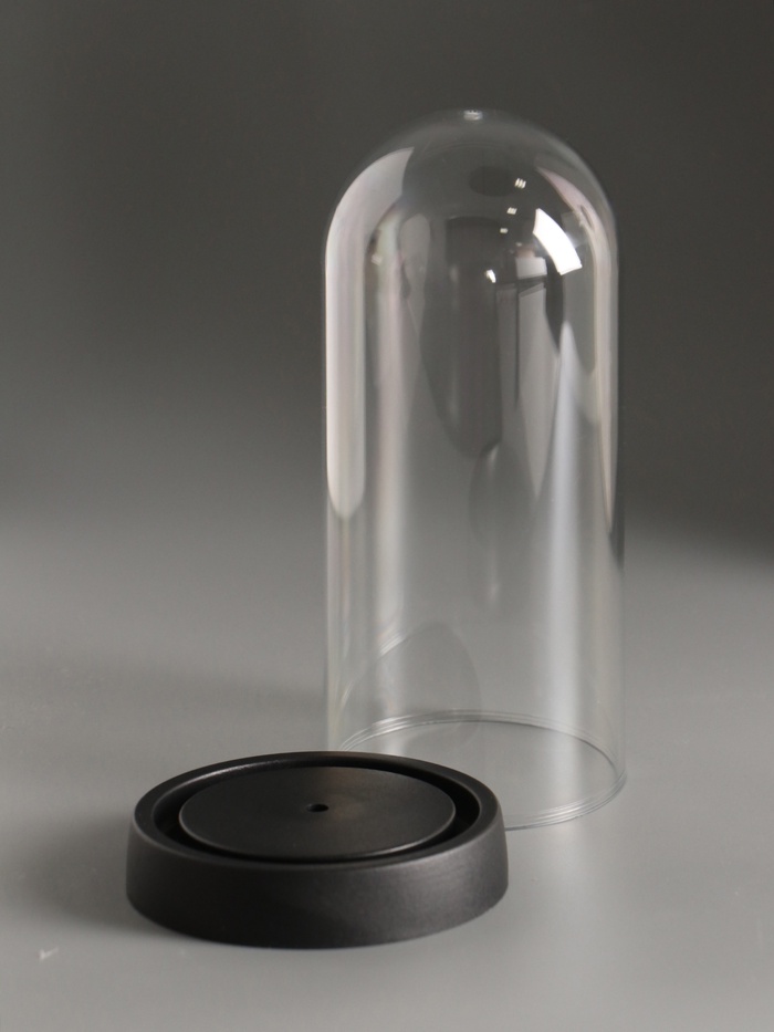 Легкая и прочная конструкция обеспечивает удобство в использовании и надежную защиту содержимого от пыли и повреждений. Чёрная подставка придаёт изделию современный вид и устойчивость, позволяя разместить его как на полке, так и на столе без риска опрокидывания.