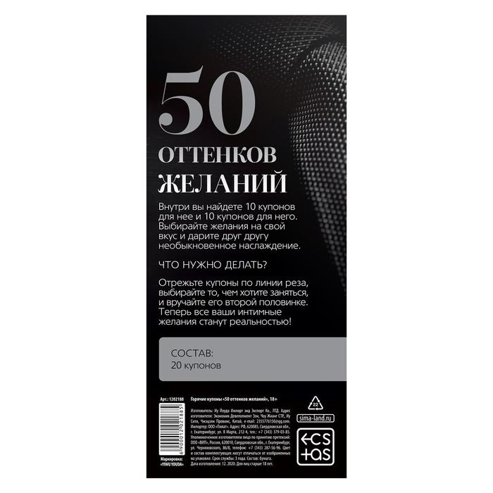 Добавьте страсть в отношения! Порадуйте себя и вторую половинку оригинальным подарком с пикантным содержанием. Горячие купоны «50 оттенков желаний» разнообразят ваши будни!