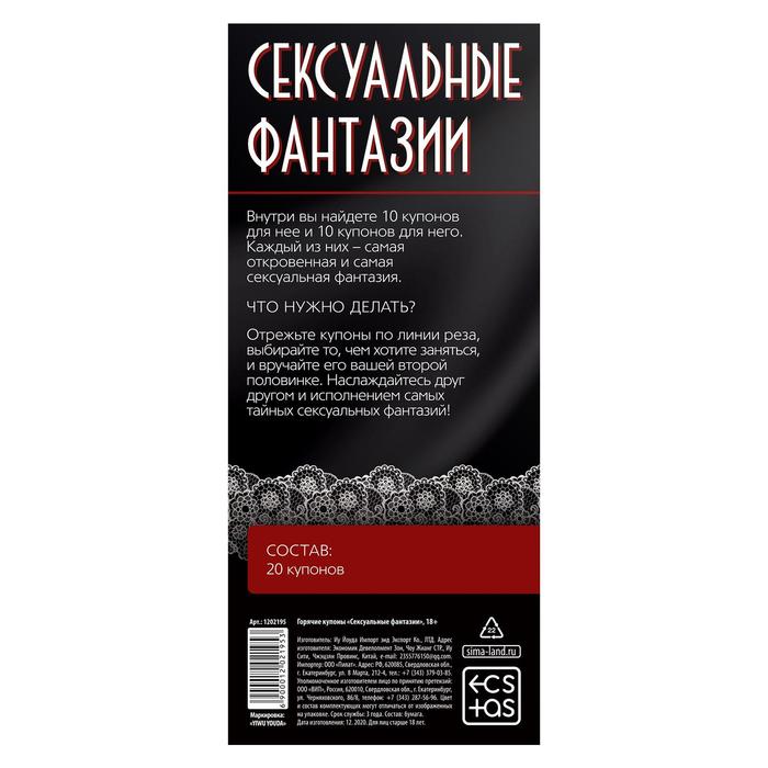 Внутри вы найдёте 10 купонов для неё и 10 купонов для него. Каждый из них — самая откровенная и самая сексуальная фантазия.