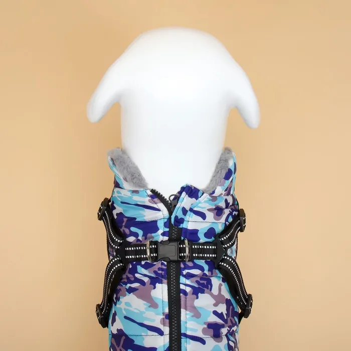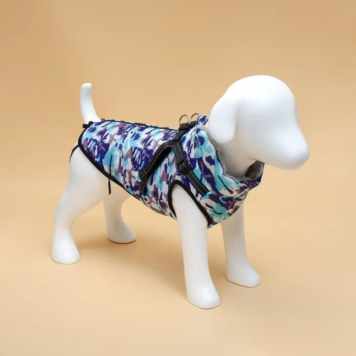 Эта камуфляжная куртка для собак со шлейкой – идеальное решение для создания стильного и защищенного образа вашего четвероногого друга. Обеспечьте своему питомцу комфорт и индивидуальность во время прогулок с этой практичной и модной курткой!